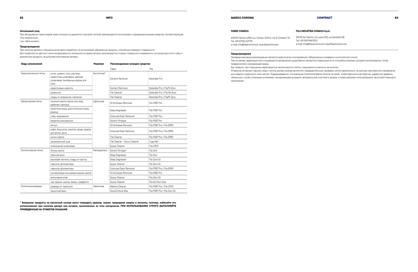 для каждого отдельного типа чистки. Подразумевается, что компания Ceramiche Marca Corona не несет ответственности за события, ущерб или дефекты,