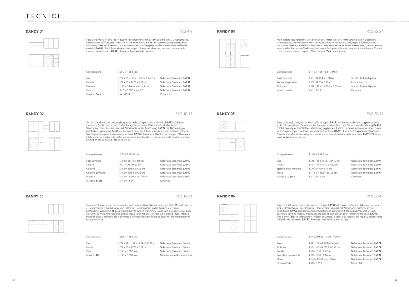 Base units, wall units, mirror with shelf and top in BA991 reinforced melamine. Lugano ceramic