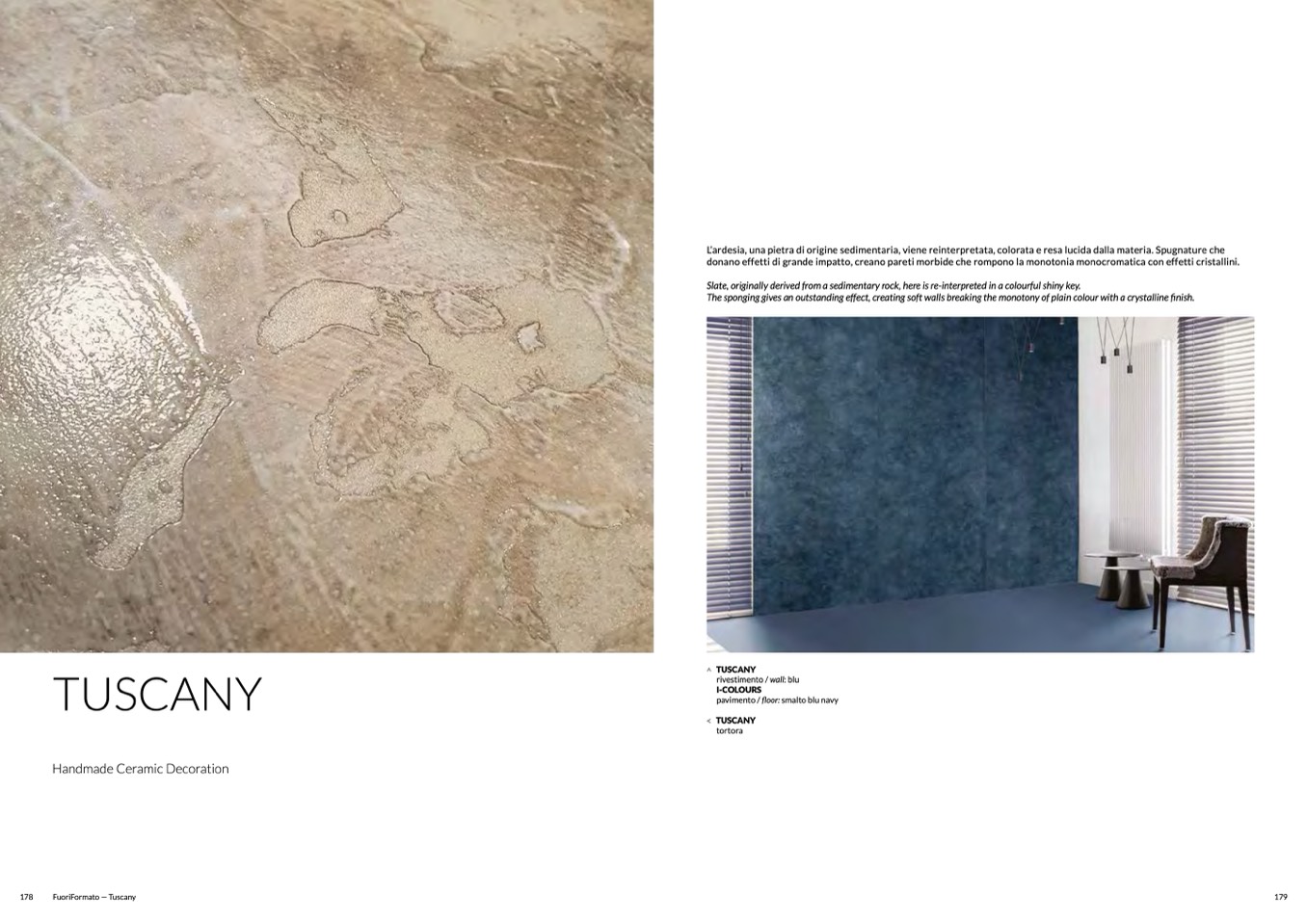L’ardesia, una pietra di origine sedimentaria, viene reinterpretata, colorata e resa lucida dalla materia. Spugnature che