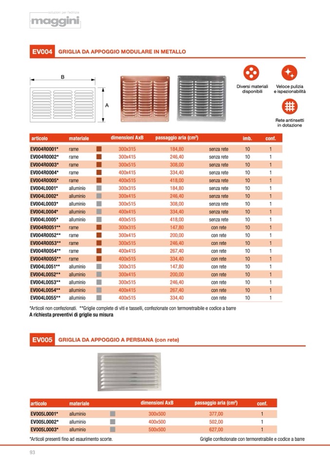 *Articoli non confezionati. **Griglie complete di viti e tasselli, confezionate con termoretraibile e codice a barre