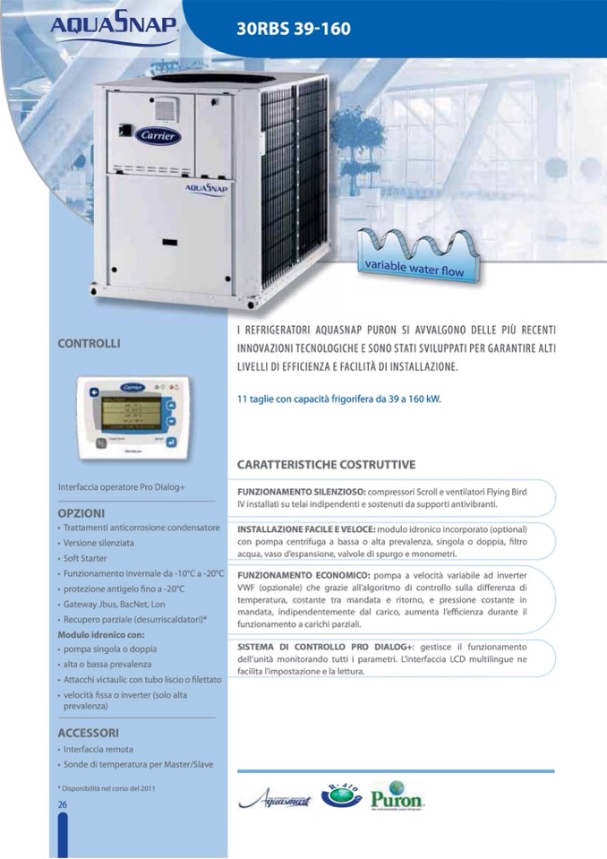 11 taglie con capacità frigorifera da 39 a 160 kW.