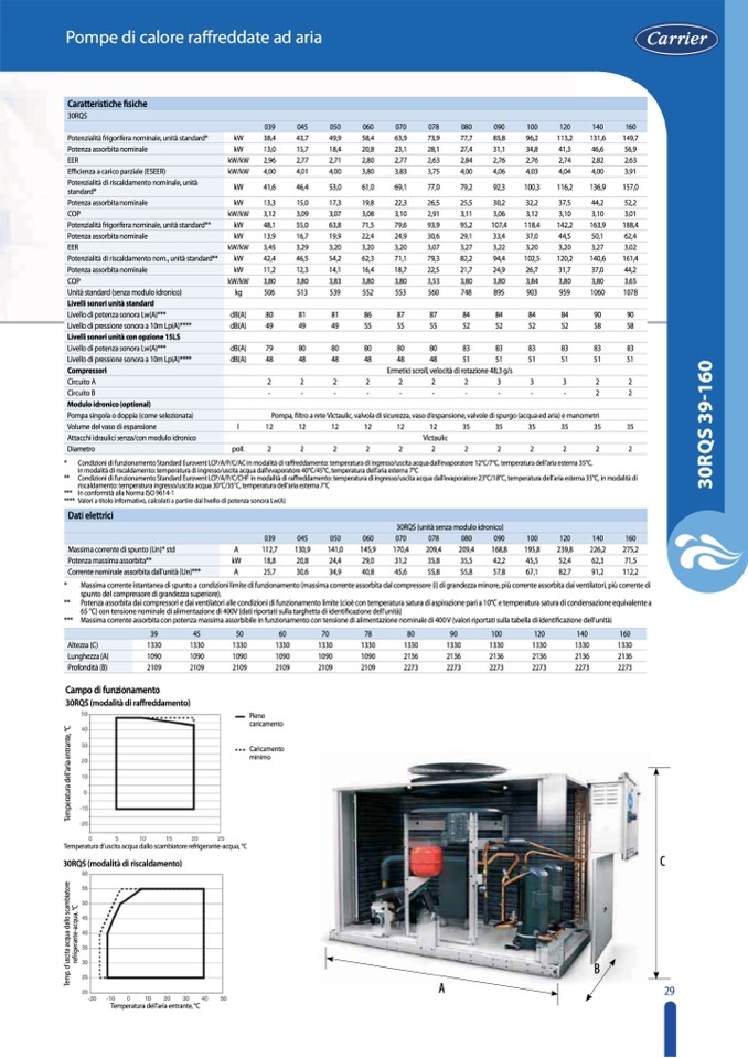 in modalità di riscaldamento: temperatura di ingresso/uscita acqua dall'evaporatore 40°C/45°C, temperatura dell'aria esterna 7°C