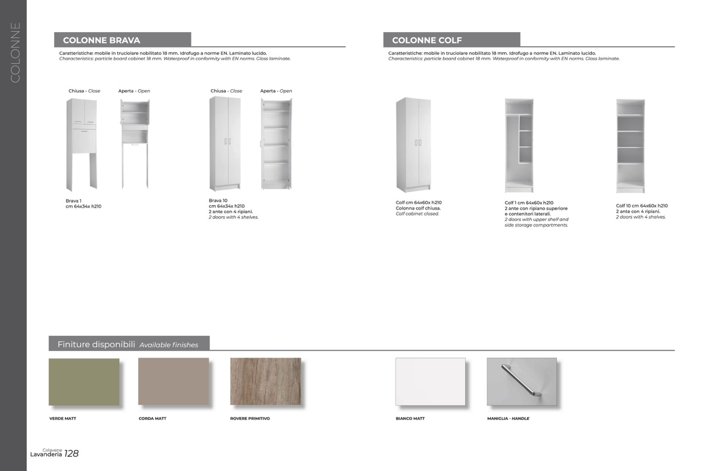 Characteristics: particle board cabinet 18 mm. Waterproof in conformity with EN norms. Gloss laminate.