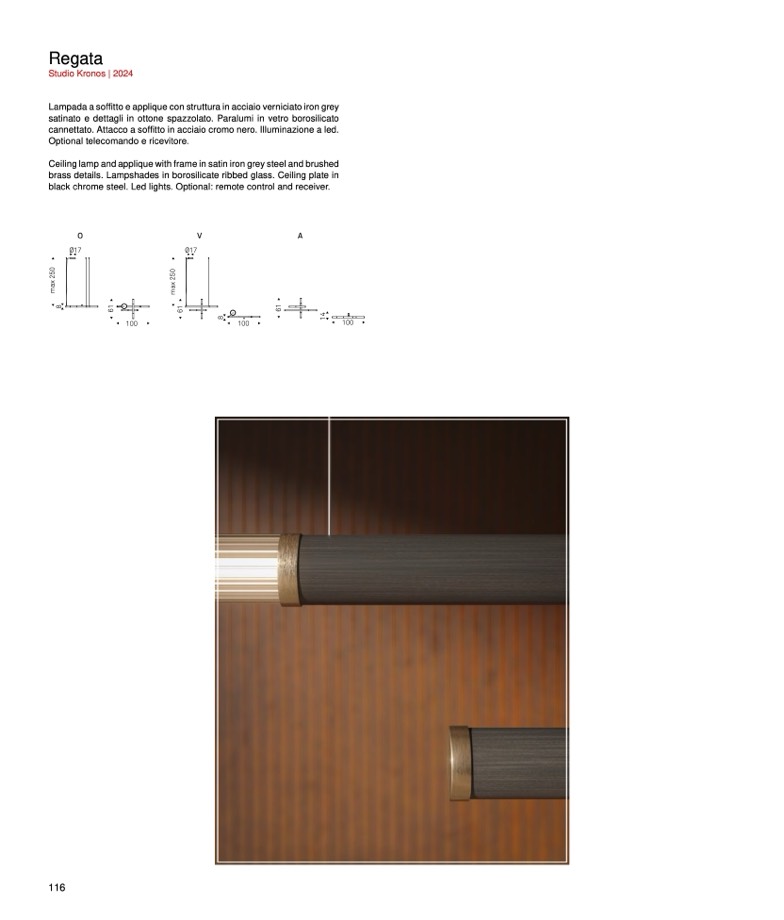 brass details. Lampshades in borosilicate ribbed glass. Ceiling plate in