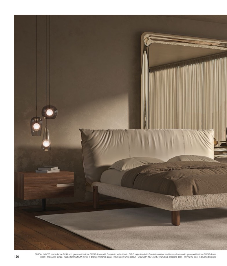 PASCAL MIXTO bed in fabric B241 and glove soft leather GLV02 dover with Canaletto walnut feet - CIRO nightstands in Canaletto walnut and bronze frame with glove soft leather GLV02 dover