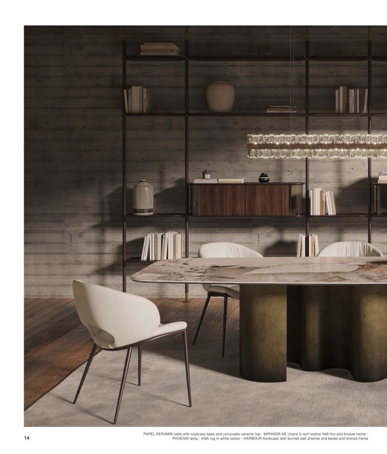 PAPEL KERAMIK table with oxybrass base and corcovado ceramic top - MIRANDA ML chairs in soft leather 948 lino and bronze frame -