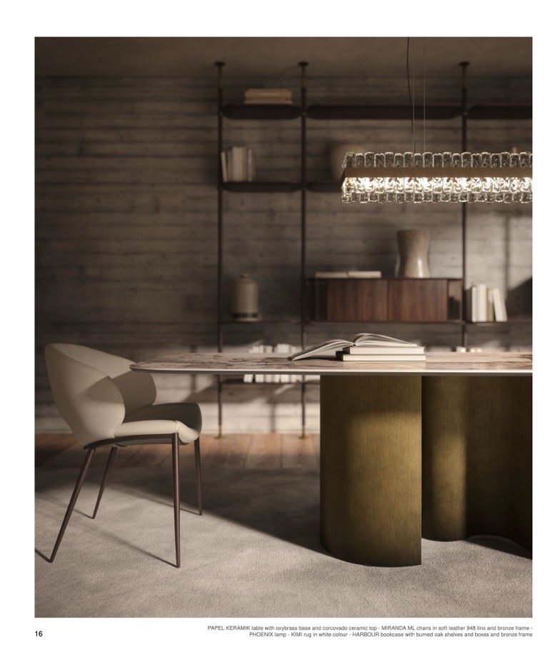 PAPEL KERAMIK table with oxybrass base and corcovado ceramic top - MIRANDA ML chairs in soft leather 948 lino and bronze frame -
