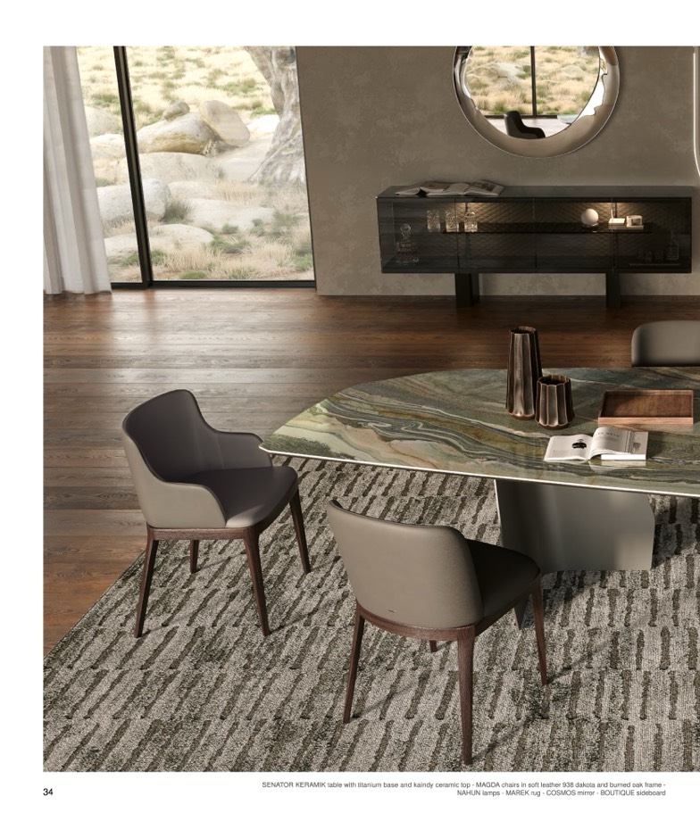 SENATOR KERAMIK table with titanium base and kaindy ceramic top - MAGDA chairs in soft leather 938 dakota and burned oak frame -