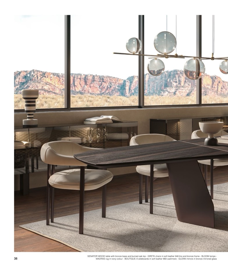 SENATOR WOOD table with bronze base and burned oak top - GRETA chairs in soft leather 948 lino and bronze frame - BLOOM lamps -