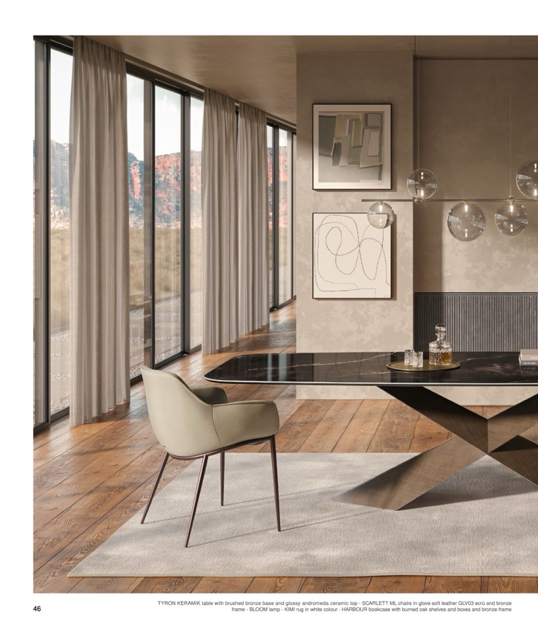 TYRON KERAMIK table with brushed bronze base and glossy andromeda ceramic top - SCARLETT ML chairs in glove soft leather GLV03 ecr