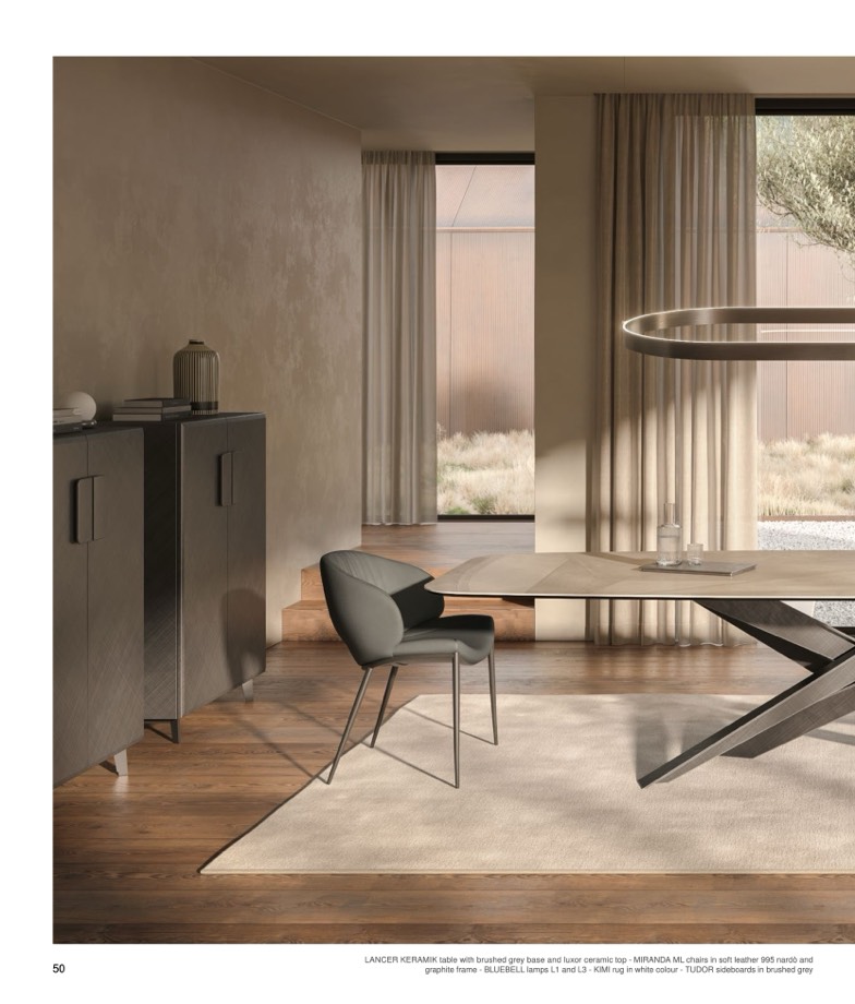 LANCER KERAMIK table with brushed grey base and luxor ceramic top - MIRANDA ML chairs in soft leather 995 nard