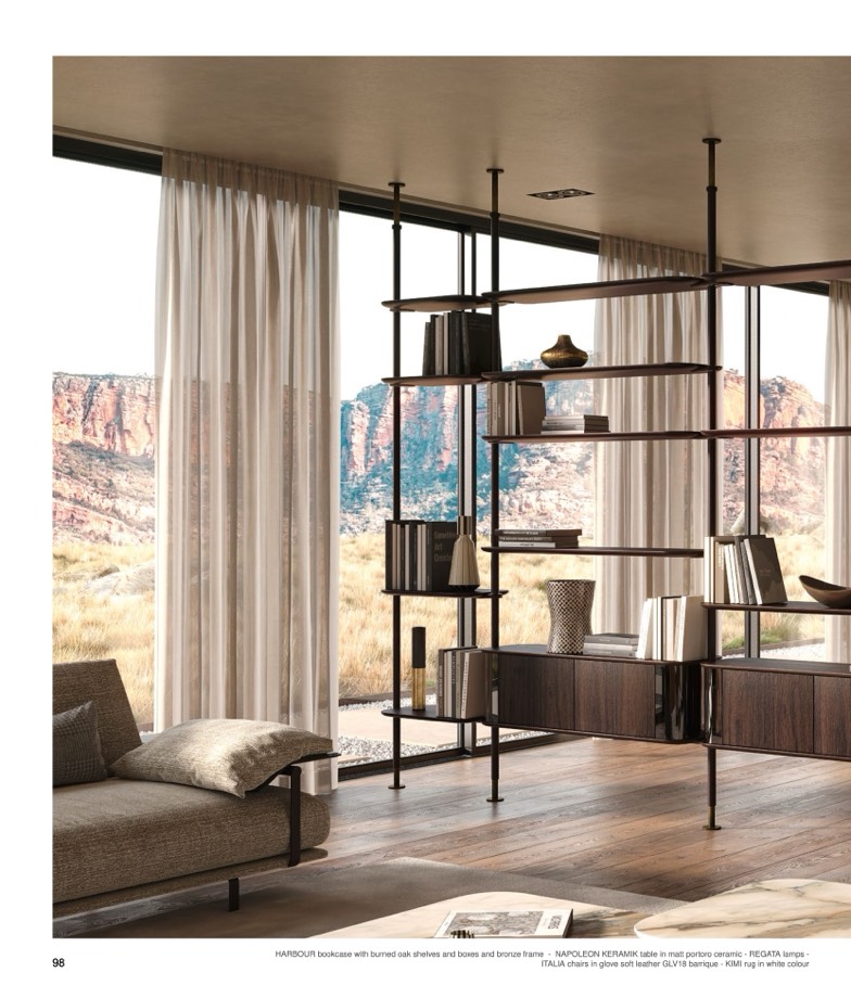 HARBOUR bookcase with burned oak shelves and boxes and bronze frame - NAPOLEON KERAMIK table in matt portoro ceramic - REGATA lamps -