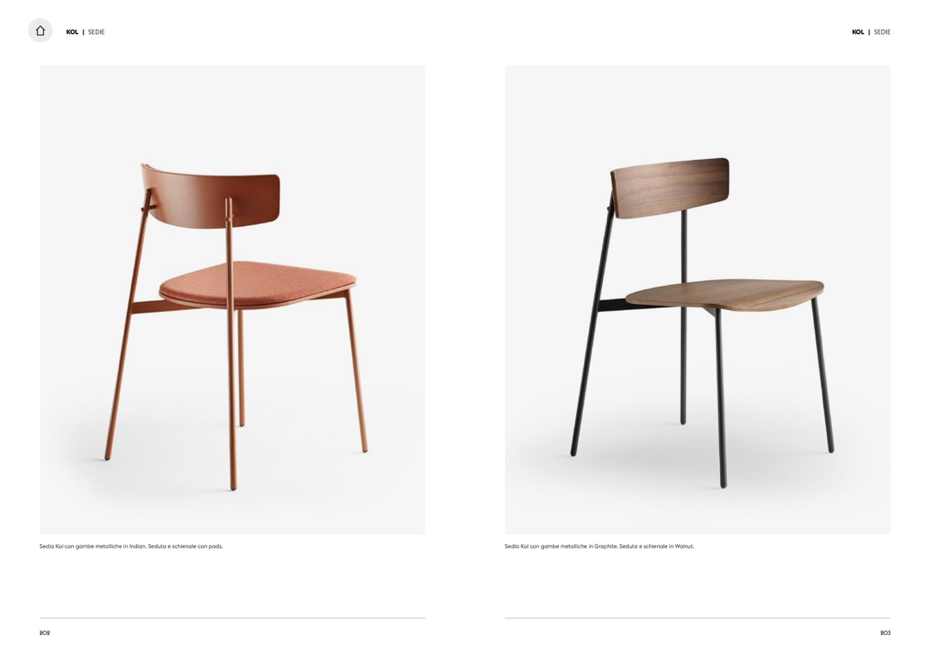 Sedia Kol con gambe metalliche in Indian. Seduta e schienale con pads.
