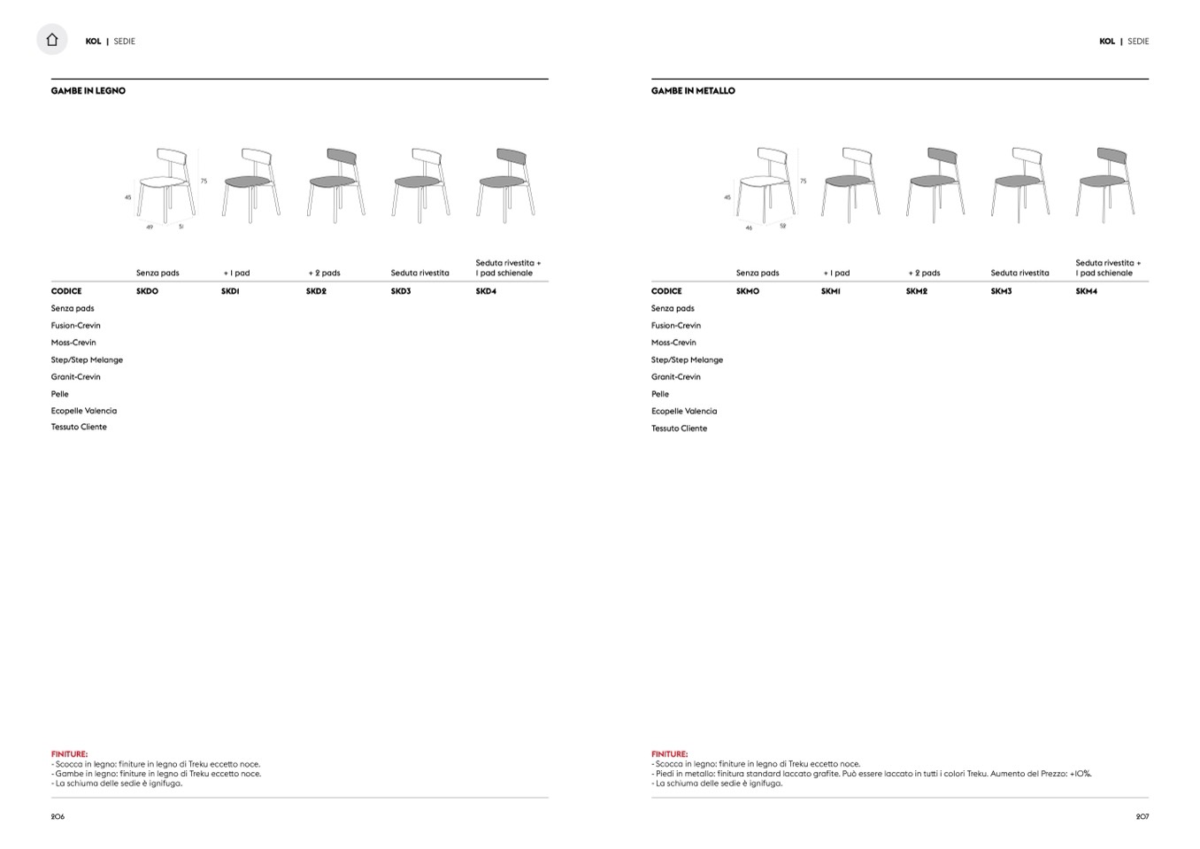 - Gambe in legno: finiture in legno di Treku eccetto noce.