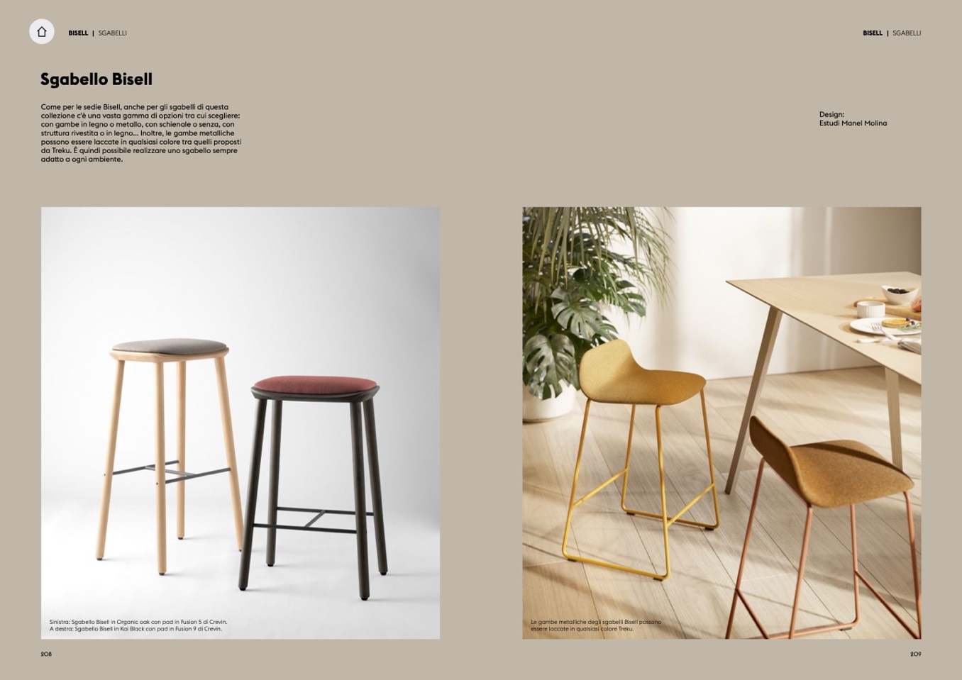 Come per le sedie Bisell, anche per gli sgabelli di questa