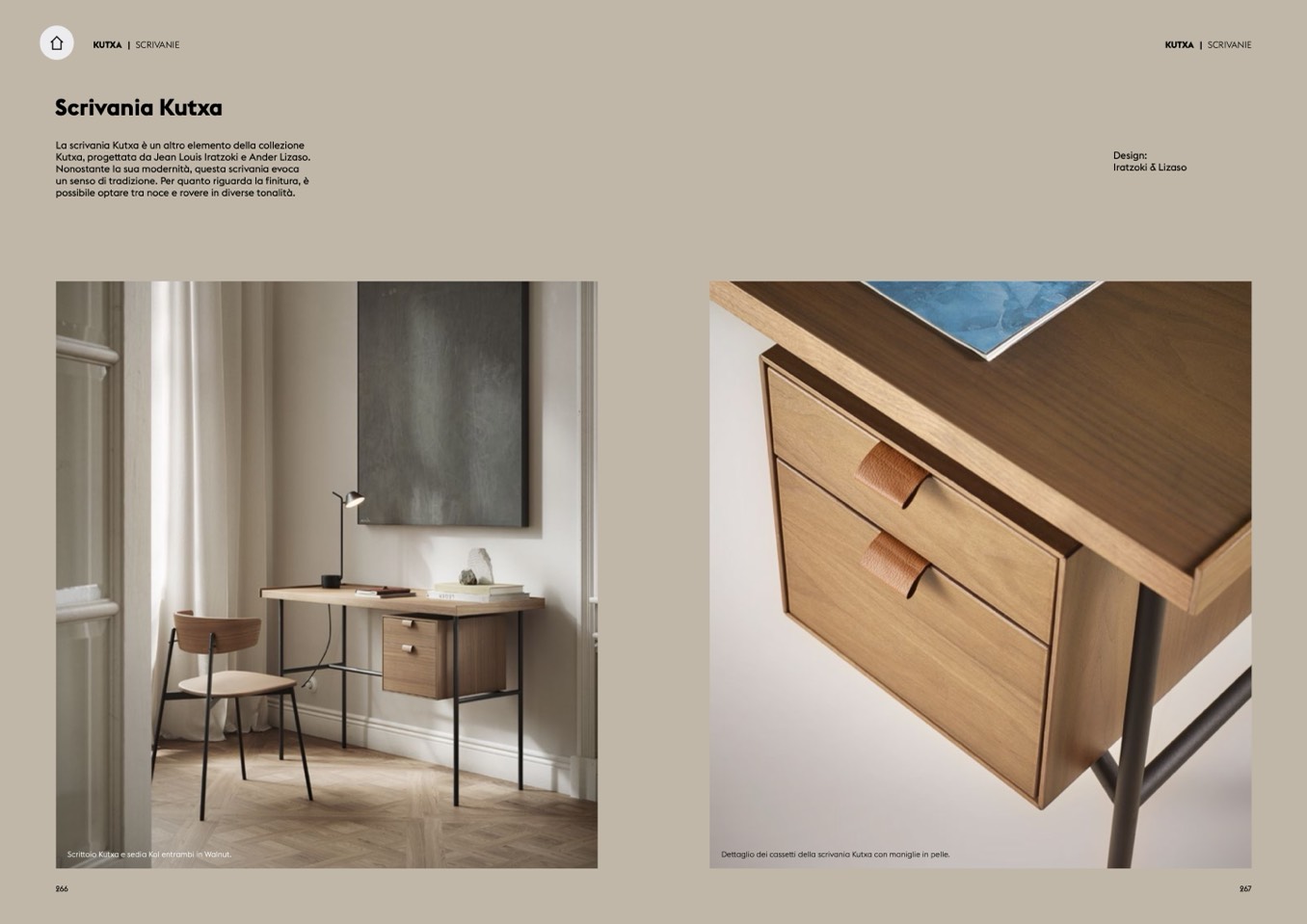 Dettaglio dei cassetti della scrivania Kutxa con maniglie in pelle.