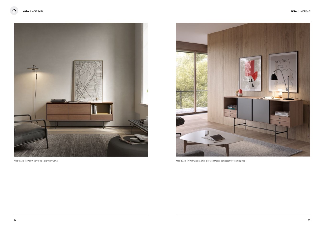 Madia Aura in Walnut con vani a giorno in Moss e porte scorrevoli in Graphite.