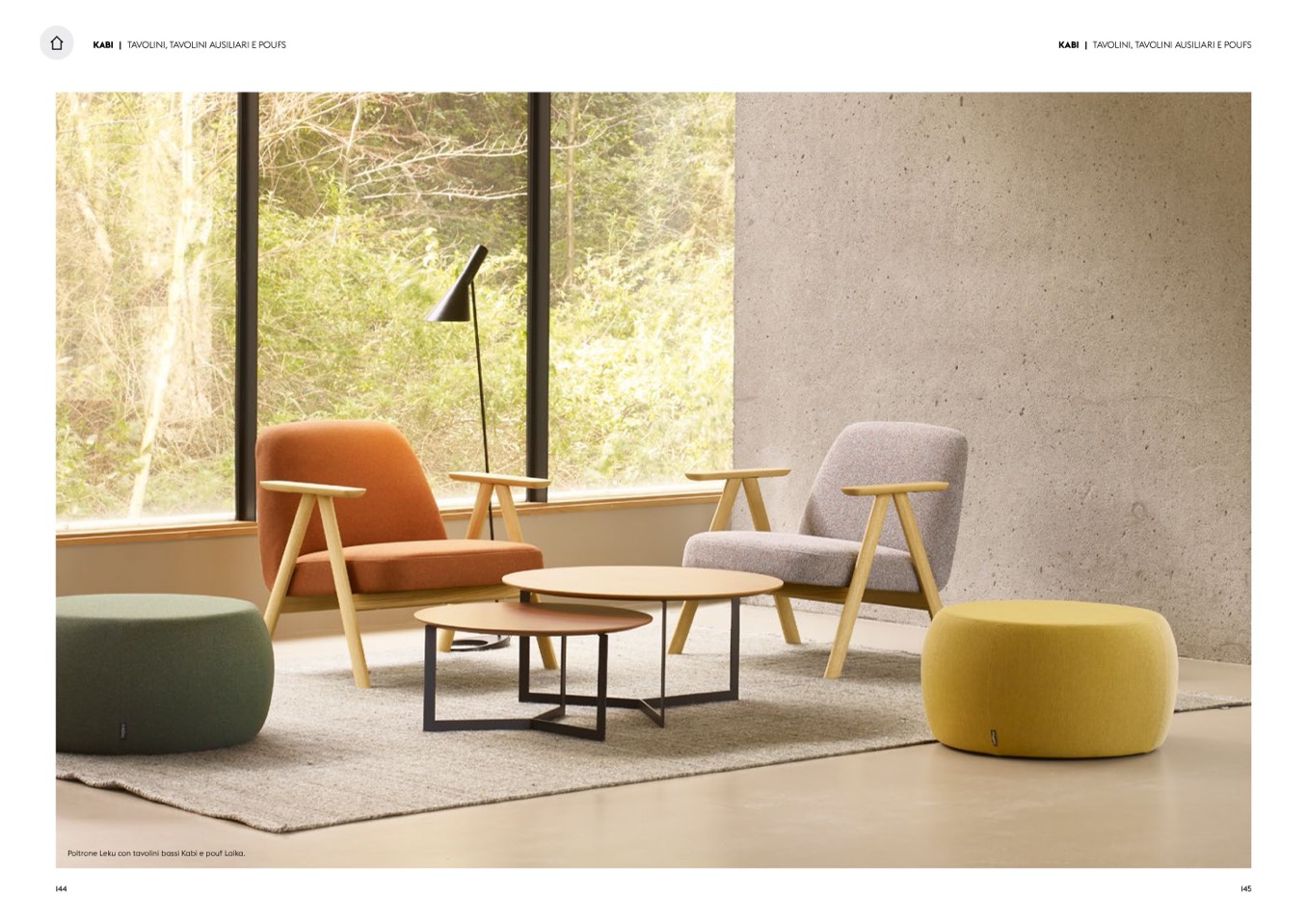 Poltrone Leku con tavolini bassi Kabi e pouf Laika.