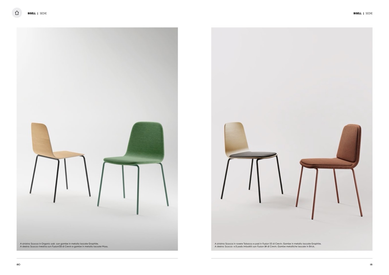 A destra: Scocca rivestita con Fusion132 di Crevin e gambe in metallo laccate Moss.