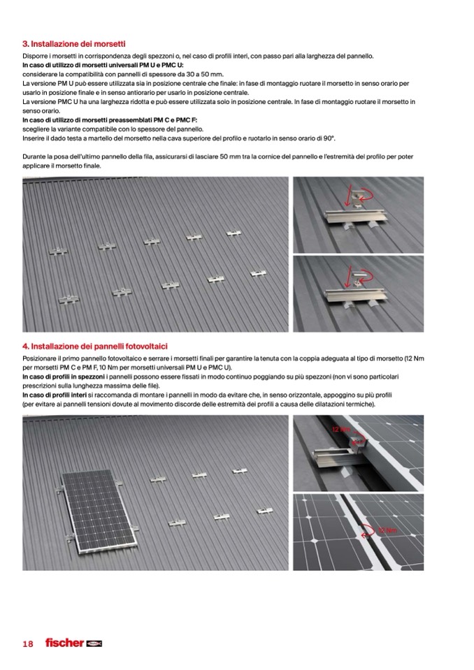 Posizionare il primo pannello fotovoltaico e serrare i morsetti finali per garantire la tenuta con la coppia adeguata al tipo di morsetto (12 Nm