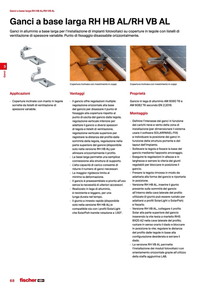 Ganci in alluminio a base larga per l‘installazione di impianti fotovoltaici su coperture in tegole con listelli di