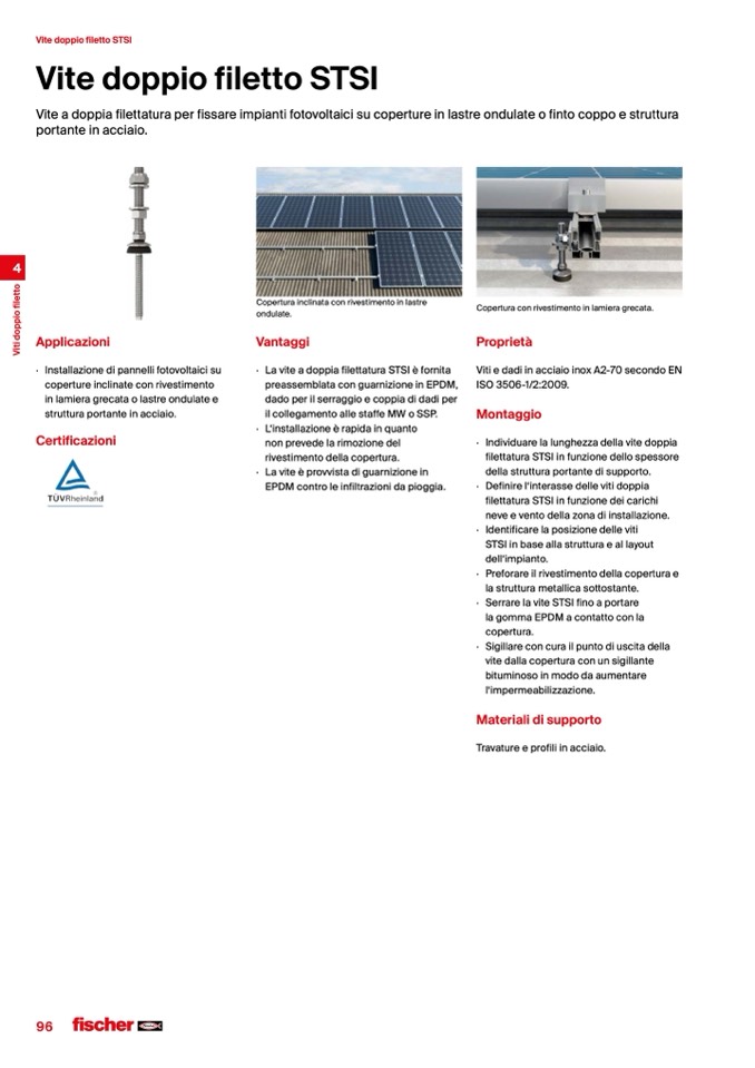 Vite a doppia filettatura per fissare impianti fotovoltaici su coperture in lastre ondulate o finto coppo e struttura