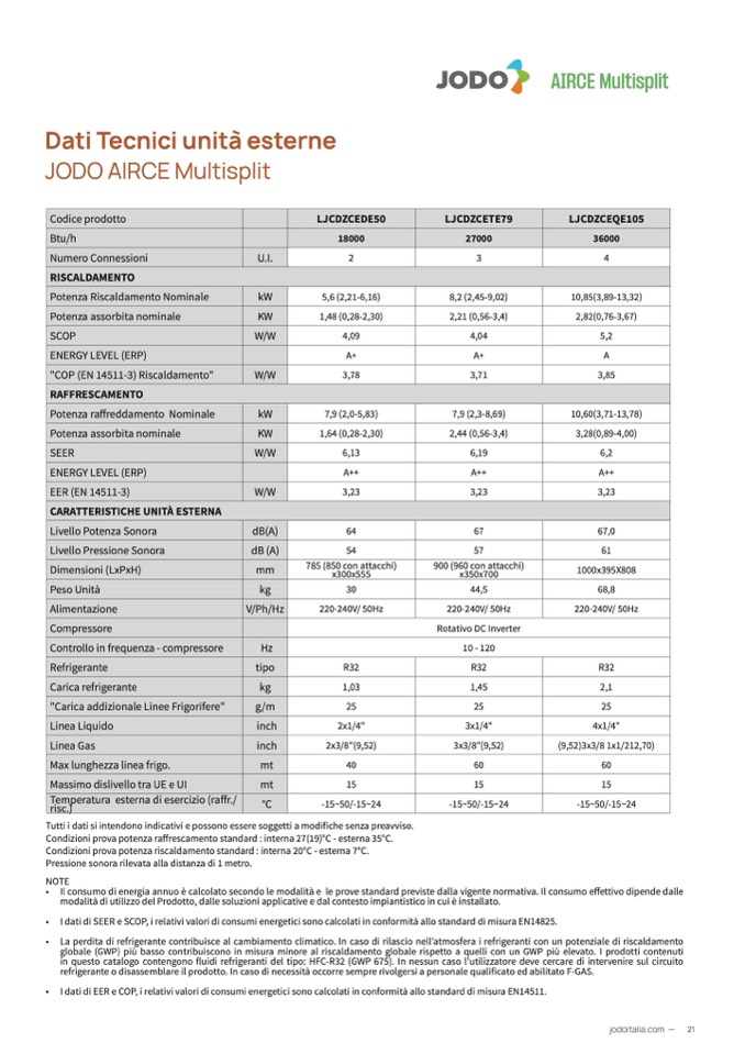 • I dati di EER e COP, i relativi valori di consumi energetici sono calcolati in conformit