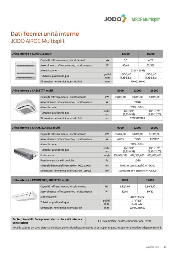 Nota: la sezione del cavo elettrico è indicata per una lunghezza massima di 15 m, per lunghezze superiori prevedere adeguate sezioni.
