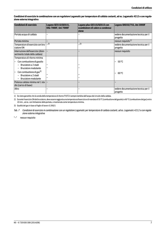 Tab. 7 Condizioni di esercizio in combinazione con un regolatore Logamatic per temperature di caldaia costanti, ad es. Logamatic 4212 o con regola-