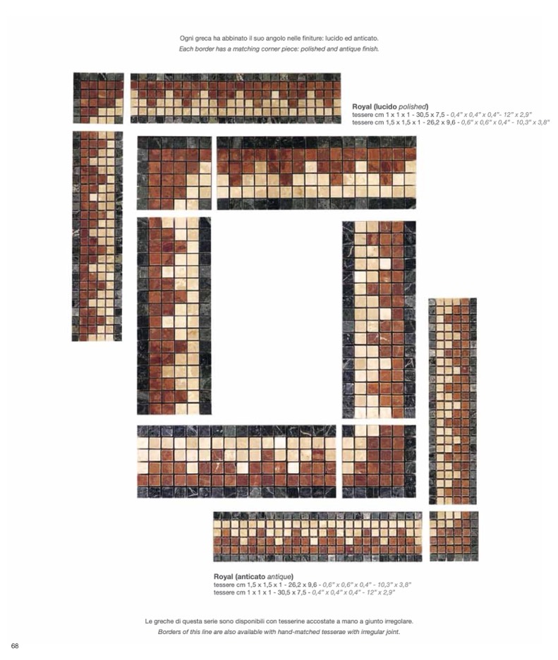 Le greche di questa serie sono disponibili con tesserine accostate a mano a giunto irregolare.