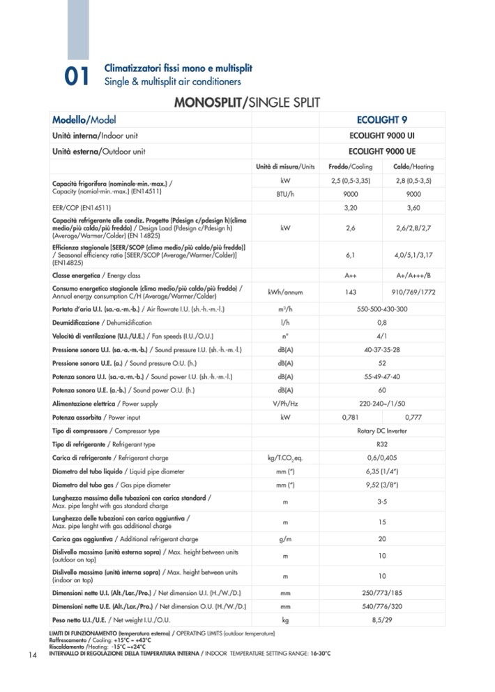 Raffrescamento / Cooling: +15°C ~ +43°C