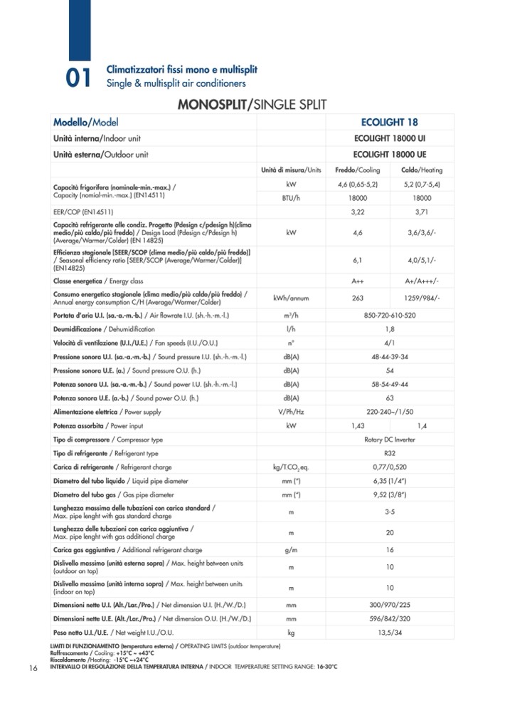 INTERVALLO DI REGOLAZIONE DELLA TEMPERATURA INTERNA / INDOOR TEMPERATURE SETTING RANGE: 16-30°C