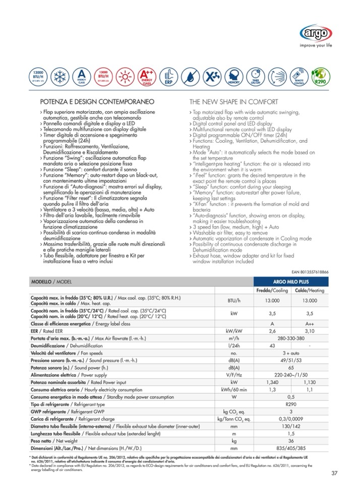 * Data declared in compliance with EU Regulation no. 206/2012, as regards to ECO-design requirements for air conditioners and comfort fans, and EU Regulation no. 626/2011, concerning the