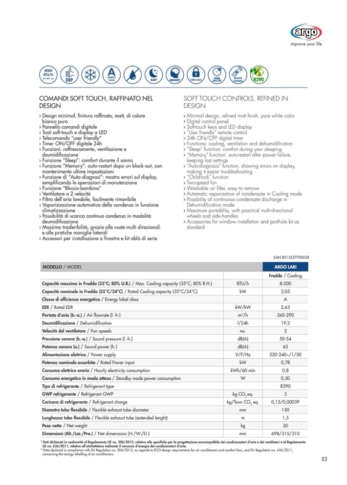 * Data declared in compliance with EU Regulation no. 206/2012, as regards to ECO-design requirements for air conditioners and comfort fans, and EU Regulation no. 626/2011,