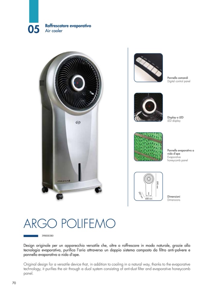 technology, it purifies the air through a dual system consisting of anti-dust filter and evaporative honeycomb