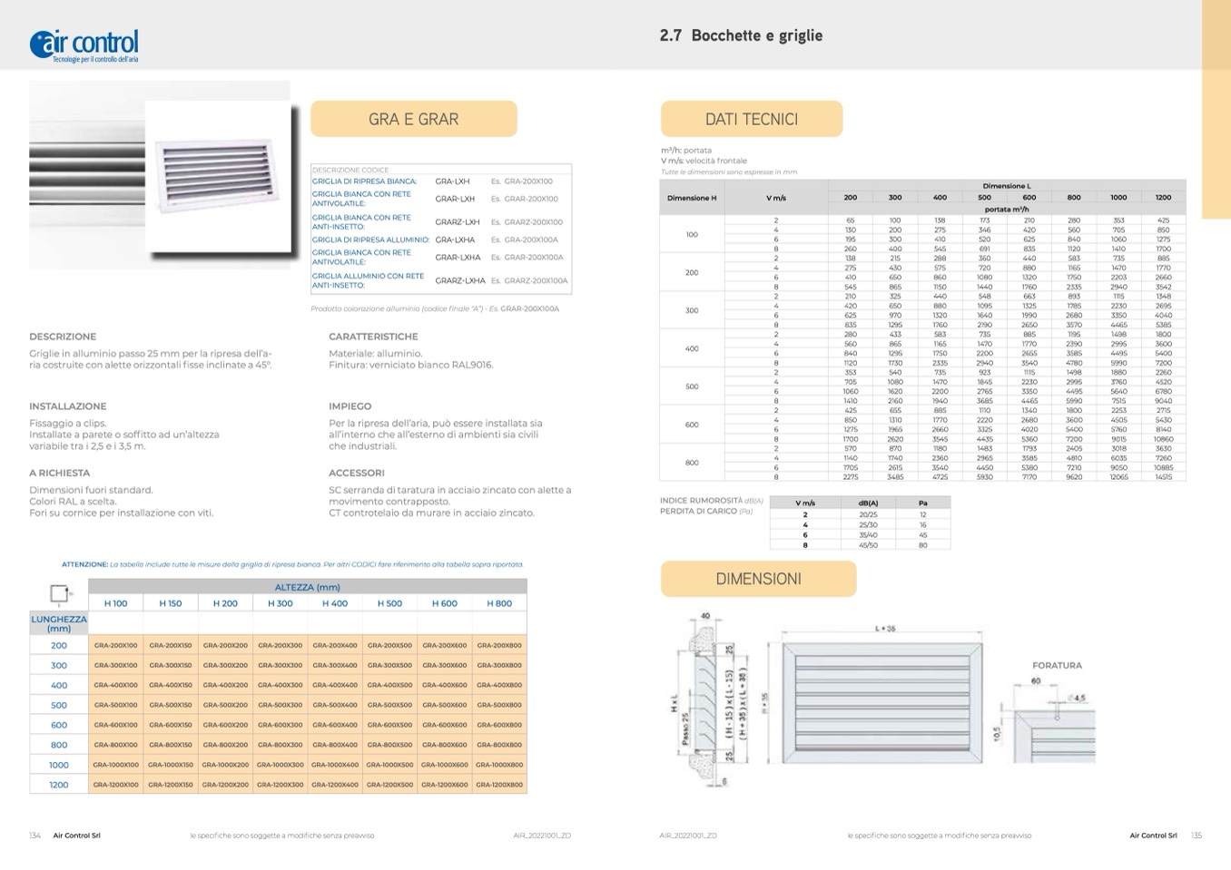 ATTENZIONE: La tabella include tutte le misure della griglia di ripresa bianca. Per altri CODICI fare riferimento alla tabella sopra riportata.