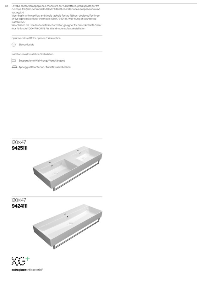 or five tapholes (only for the model 120x47 9424111). Wall-hung or countertop