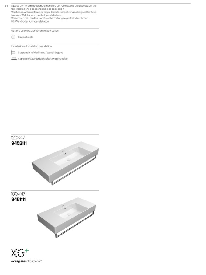 168 Lavabo con foro troppopieno e monoforo per rubinetteria, predisposto per tre