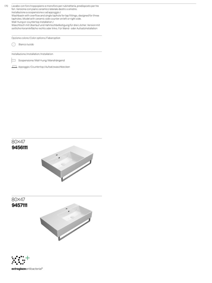 170 Lavabo con foro troppopieno e monoforo per rubinetteria, predisposto per tre