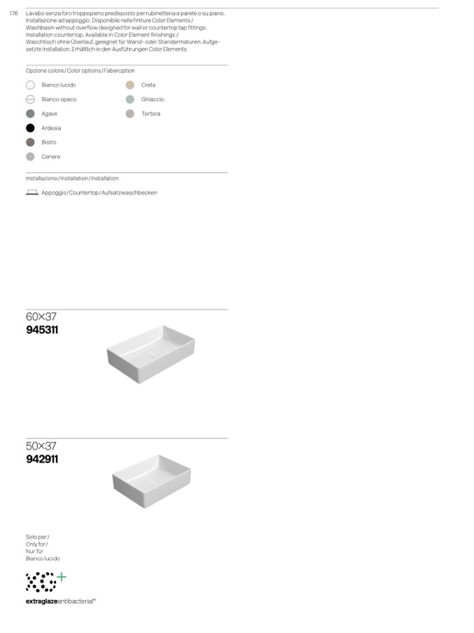 176 Lavabo senza foro troppopieno predisposto per rubinetteria a parete o su piano.