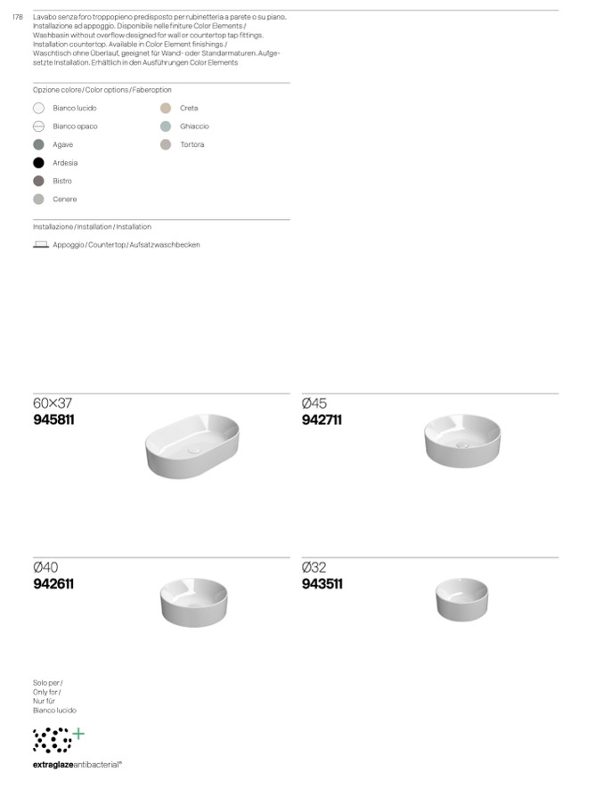 178 Lavabo senza foro troppopieno predisposto per rubinetteria a parete o su piano.