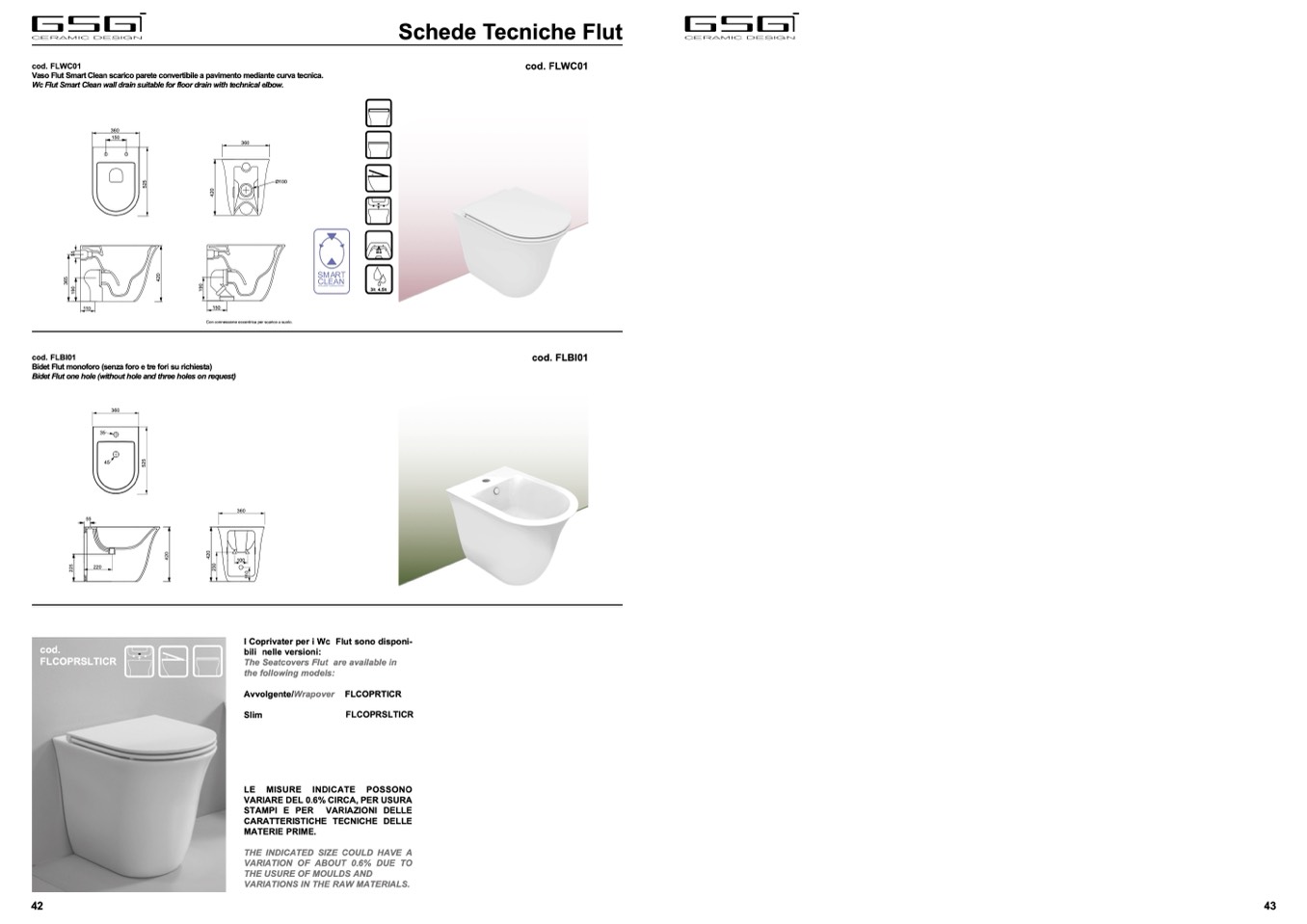 Vaso Flut Smart Clean scarico parete convertibile a pavimento mediante curva tecnica.
