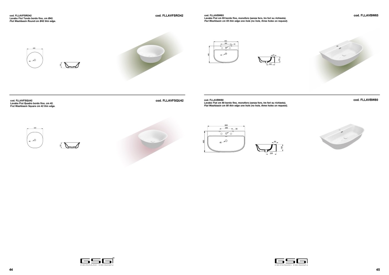 Lavabo Flut cm 65 bordo fino, monoforo (senza foro, tre fori su richiesta).