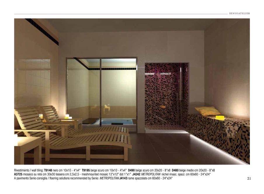 Rivestimento / wall tiling: T9148 nero cm 10x10 - 4”x4” T9195 beige scuro cm 10x10 - 4”x4” D490 beige scuro cm 20x20 - 8”x8 D480 beige medio cm 20x20 - 8”x8