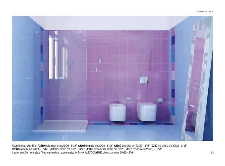 Rivestimento / wall tiling: A2550 cielo azzurro cm 20x20 - 8”x8” A370 bleu navy cm 20x20 - 8”x8” A2560 cielo bleu cm 20x20 - 8”x8” D250 lilla chiaro cm 20x20 - 8”x8”