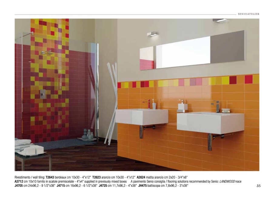 Rivestimento / wall tiling: T2643 bordeaux cm 10x30 - 4”x12” T2623 arancio cm 10x30 - 4”x12” A2624 matita arancio cm 2x20 - 3/4”x8”