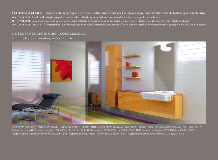 Pavimento / floor: A2610 becco d’oca (blend SOLARE) cm 20x20 - 8”x8” A110 bianco (blend LE BIACCHE) cm 20x20 - 8”x8” A980 ciclamino medio (blend CICLAMINI) cm 20x20 - 8”x8”
