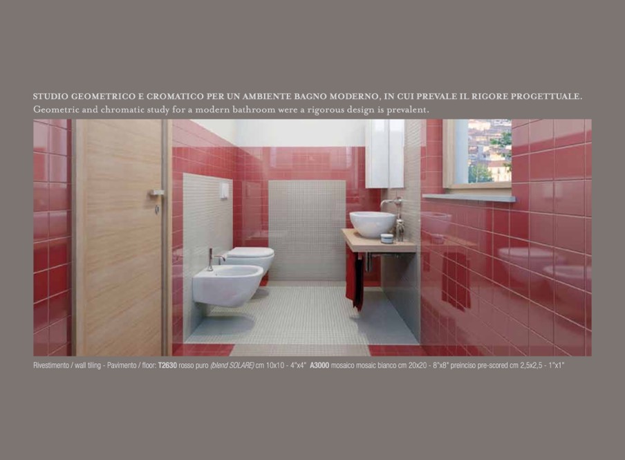 Rivestimento / wall tiling - Pavimento / floor: T2630 rosso puro (blend SOLARE) cm 10x10 - 4”x4” A3000 mosaico mosaic bianco cm 20x20 - 8”x8” preinciso pre-scored cm 2,5x2,5 - 1”x1”