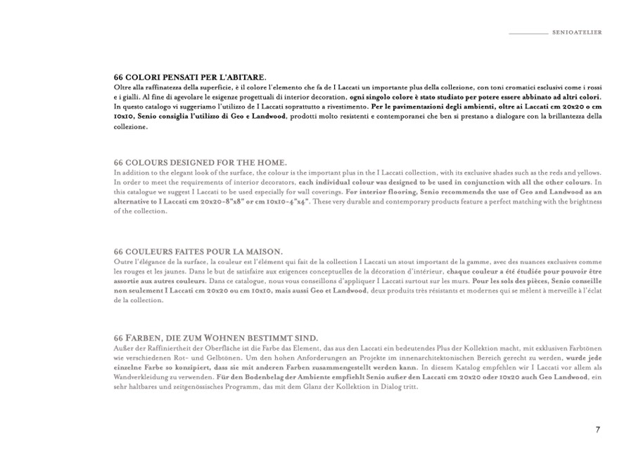 this catalogue we suggest I Laccati to be used especially for wall coverings. For interior flooring, Senio recommends the use of Geo and Landwood as an