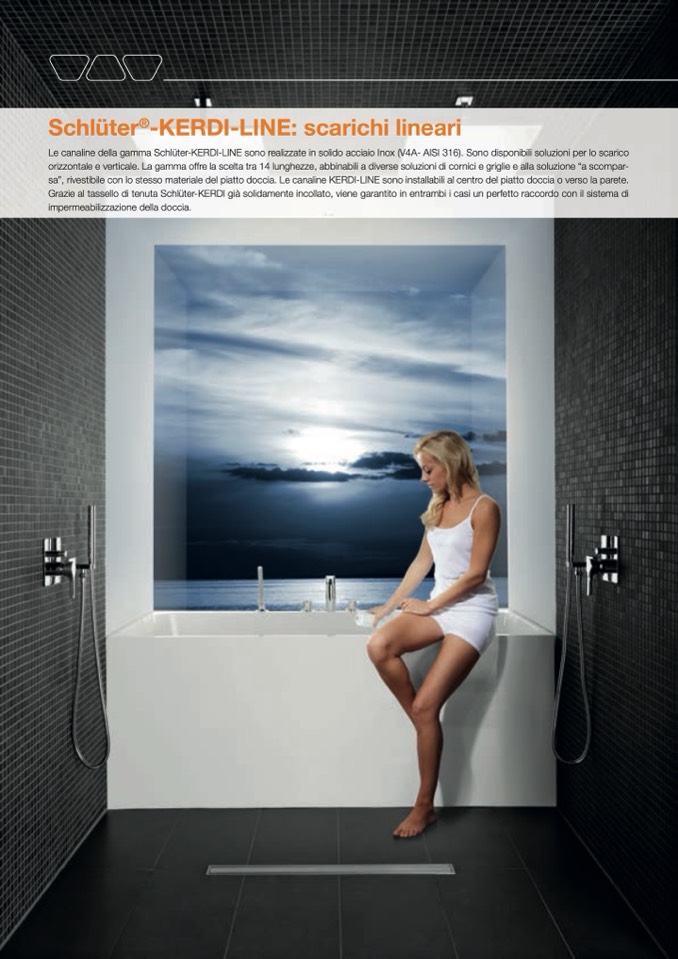 sa”, rivestibile con lo stesso materiale del piatto doccia. Le canaline KERDI-LINE sono installabili al centro del piatto doccia o verso la parete.